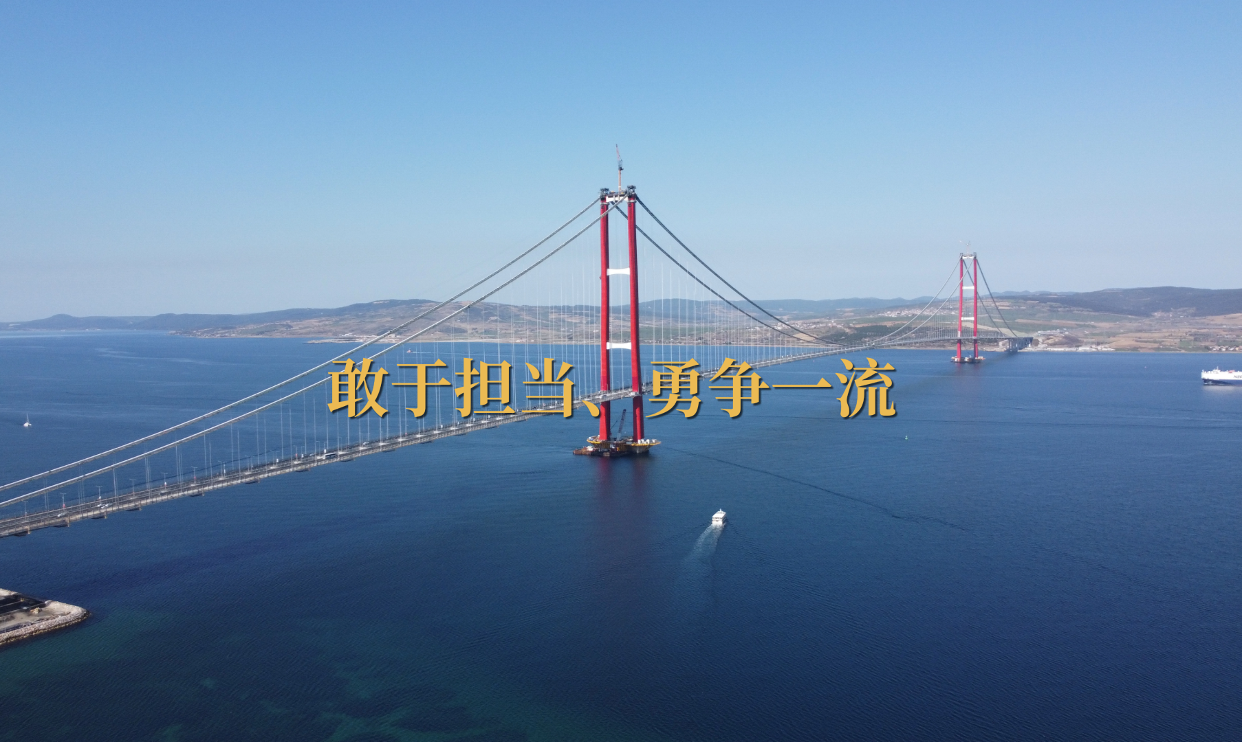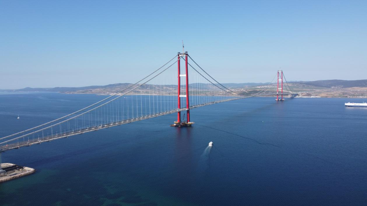 跨越土耳其馬爾馬拉海西端的達(dá)達(dá)尼爾海峽,連接歐亞兩洲,為雙塔三跨懸索橋,雙向六車道,橋梁主跨長度2023米,是目前世界上跨徑最大的懸索橋,于2022年3月18日建成通車。
